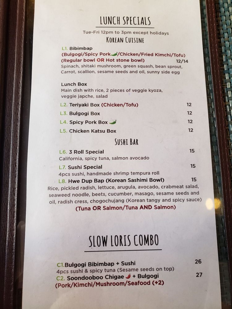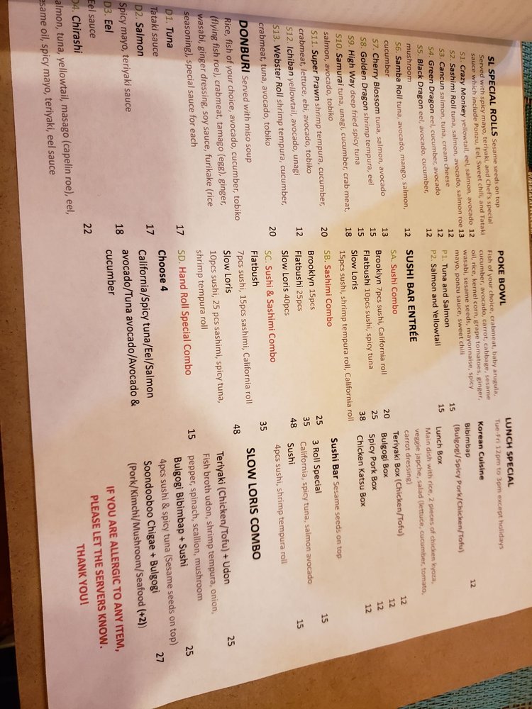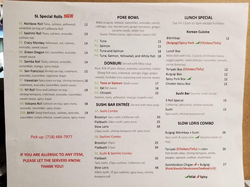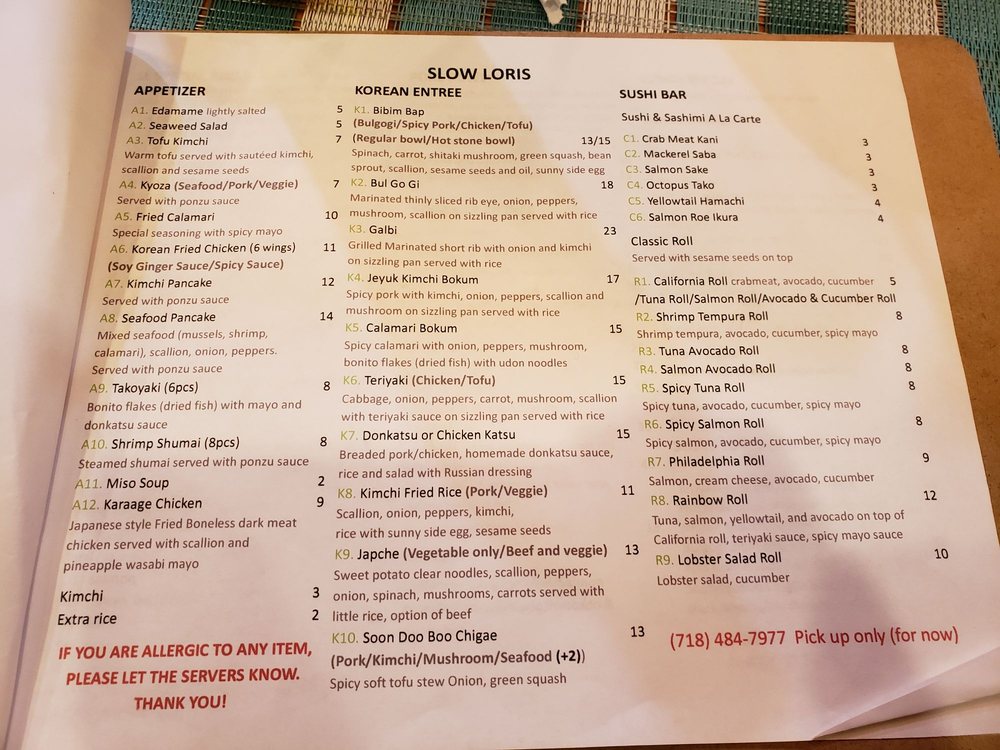 Slow Loris, a Japanese-Korean restaurant located in Brooklyn, NY, offers a diverse menu with vegan options and a trendy atmosphere. Customer reviews praise the large portions and delicious dishes such as miso soup, sushi, hot stone bibim bap, and karaage chicken. The veggie pan-fried gyoza and crunchy salmon roll are standout favorites. While some mention slower delivery times and slightly odd music choices, the overall consensus is positive. With a variety of options like kim bap, fried wings, and noodles, Slow Loris provides a unique dining experience. Despite some higher prices, the quality and taste of the food are worth it. The intimate setting and friendly staff make for a pleasant dining experience, earning Slow Loris a place as a hidden gem in the Flatbush area.